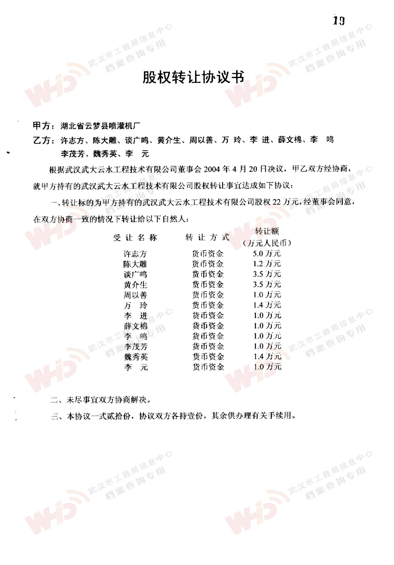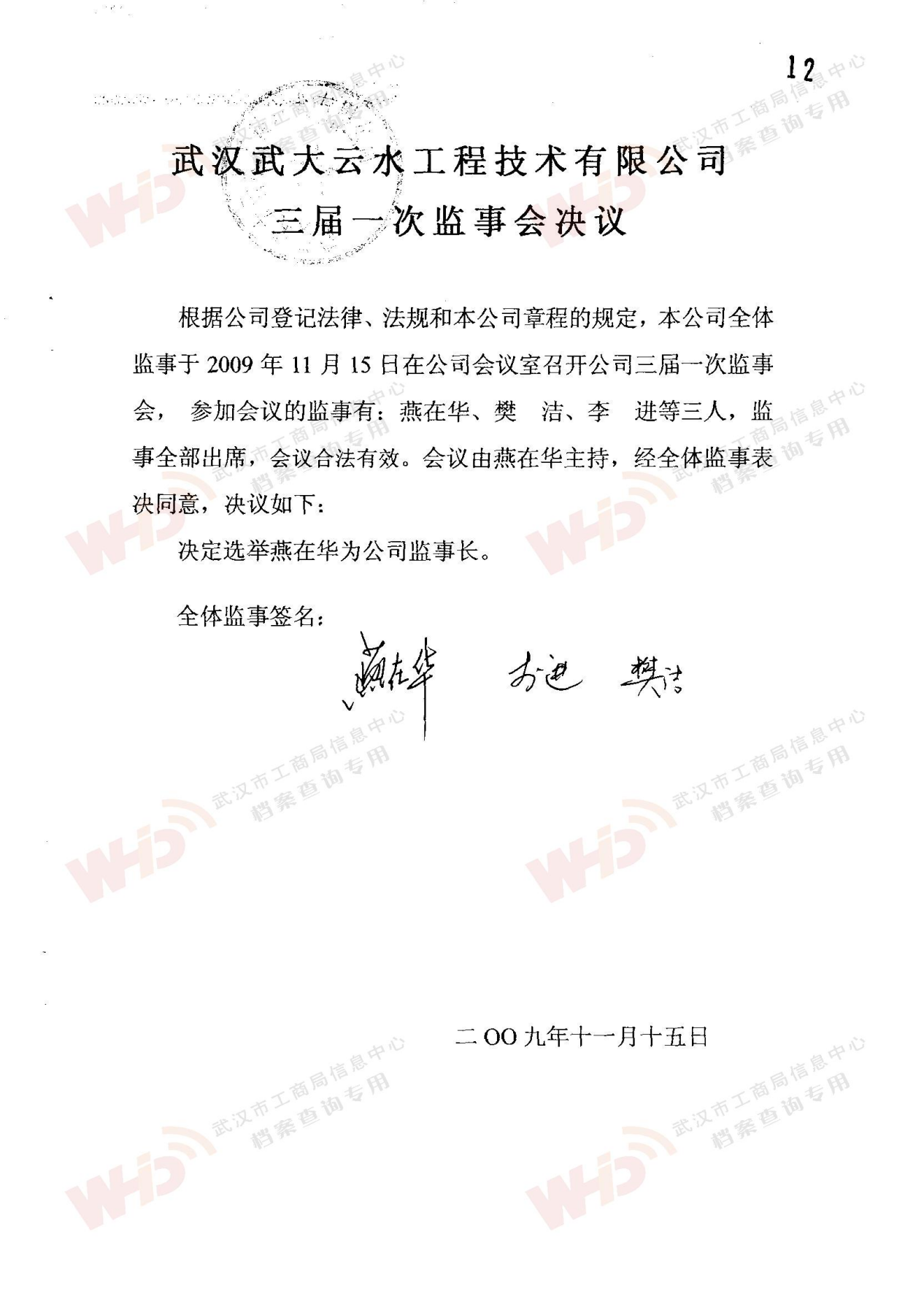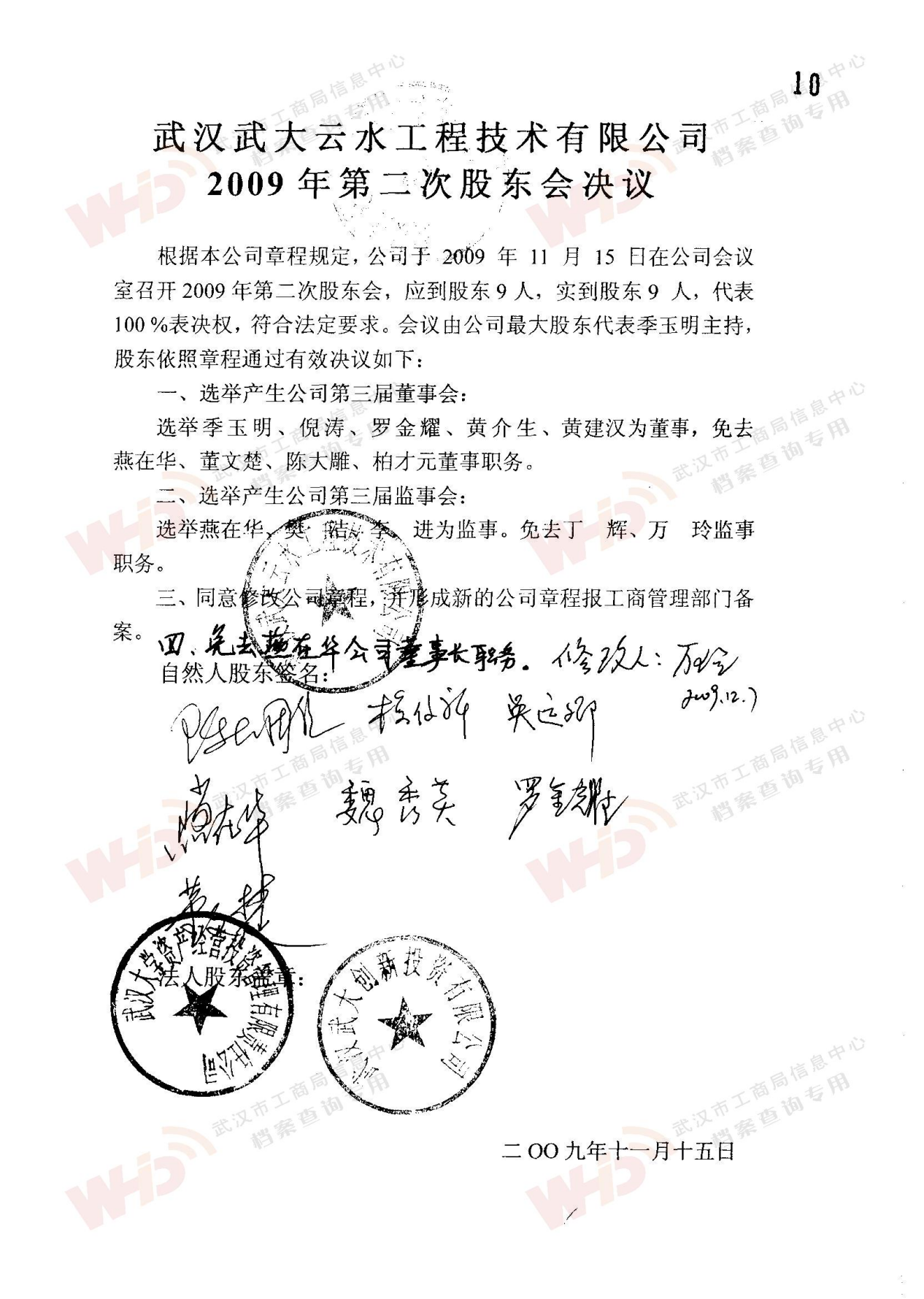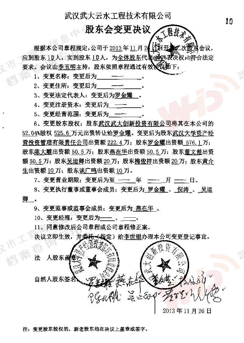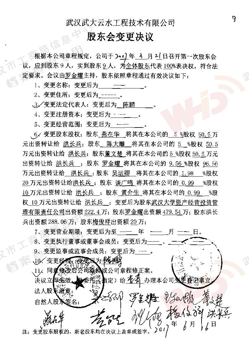 - 2009年11月15日武漢武大云水工程技術有限公司三屆一次董事會決議: 一、決定聘請談廣鳴為公司名譽董事長。 二、決定選舉季玉明為公司董事長,公司法人代表。免去燕在華公司董事長職務。 三、經董事長季玉明提名,決定聘任羅金耀為公司總經理。 四、經公司總經理提名,決定聘任劉軍強為公司副總經理。 五、經公司總經理提名,決定聘任龔明新為公司財務總監(jiān),燕在華為市場總監(jiān),陳大雕為技術總監(jiān),董文楚為研究所所長。 經董事長提名,決定聘任萬玲為董事會秘書。