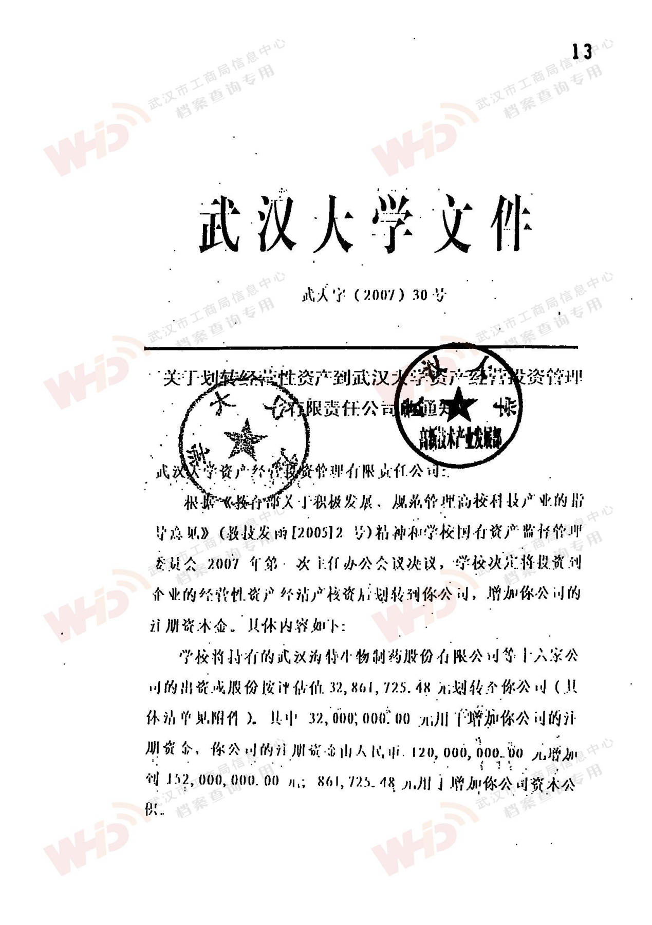 - 2007年7月30號武漢大學發(fā)文:關于劃轉經營性資產到武漢大學資產經營投資管理有限責任公司的通知