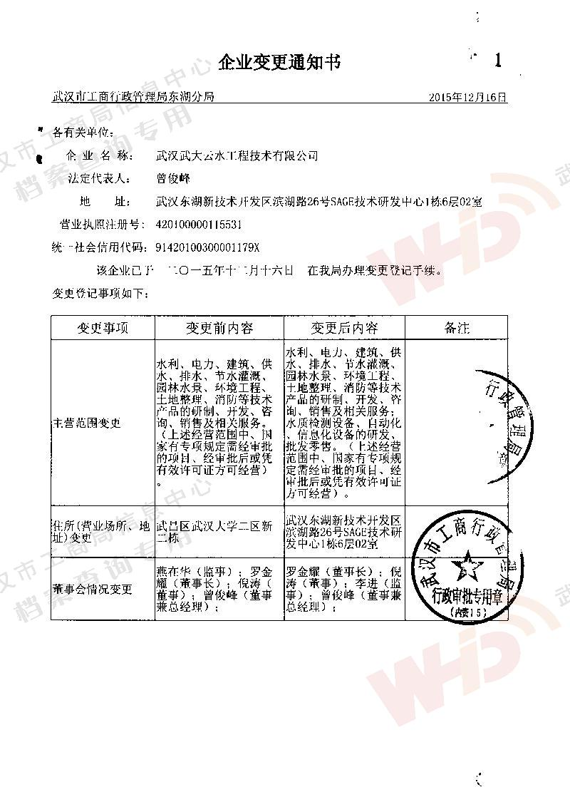 - 2003年7月25日公司名變更為武漢武大云水工程技術有限公司。武漢大學同意使用“武大”冠名。